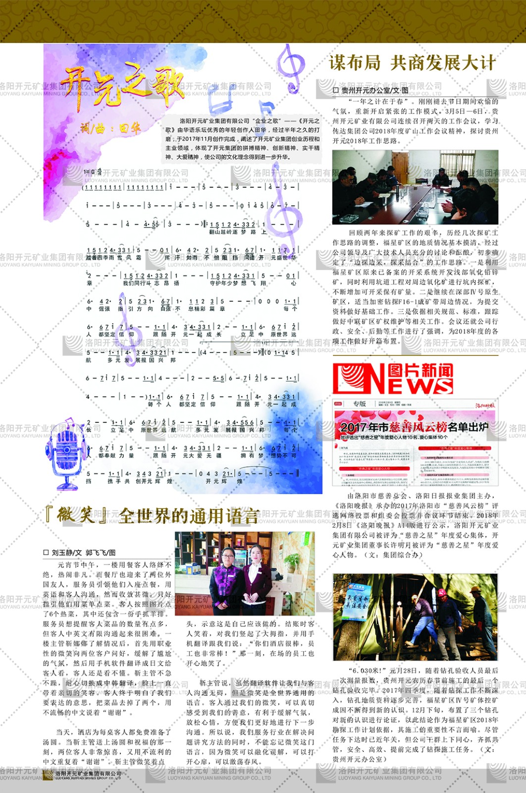 洛陽開元礦業(yè)集團有限公司簡介洛陽開元礦業(yè)集團有限公司,始成立于2006年,位于洛陽市開元大道269號。集團旗下共有十余家全資子公司,業(yè)務(wù)涉及有色金屬礦山開發(fā)、礦產(chǎn)品購銷與進出口貿(mào)易、房地產(chǎn)開發(fā)、文化藝術(shù)、企業(yè)管理與咨詢、資本投資等多個領(lǐng)域。民建河南省委委員、民建河南省委企業(yè)委副主任、民建洛陽市委委員、企業(yè)委主任、洛陽民建企業(yè)家協(xié)會會長許明月是公司創(chuàng)始人,現(xiàn)任洛陽開元礦業(yè)集團有限公司董事長。在礦業(yè)領(lǐng)域,洛陽開元礦業(yè)集團擁有多家實力雄厚的子公司:貴州開元礦業(yè)有限公司探、采礦權(quán)面積共11.33平方公里;興海縣銅鑫礦業(yè)有限公司探礦權(quán)面積8.76平方公里,礦山資源潛力巨大;2021年,開元集團與盧氏中科礦業(yè)有限公司開展戰(zhàn)略合作。盧氏中科礦業(yè)有限公司專注于有色金屬的浮選、加工和銷售,擁有強大的技術(shù)支撐平臺,是集探、采、選、冶、研為一體的中大型綜合礦業(yè)企業(yè)。目前,盧氏中科王家河1000噸選礦廠已成功投產(chǎn),雙河金礦、柳關(guān)欒盧鉛鋅礦相繼順利開工,樓房銀礦與圪老灣鉛鋅礦的深部探礦重大突破,標(biāo)志著礦山版圖取得重大進展,為開元集團后續(xù)發(fā)展奠定了堅實基礎(chǔ)。在文化傳媒領(lǐng)域,洛陽市明月美術(shù)館通過豐富多樣的藝術(shù)展覽、學(xué)術(shù)研討和公共教育活動,努力打造一個集展覽、交流、教育、研究為一體的綜合性藝術(shù)平臺。此外,在金融投資領(lǐng)域,開元集團旗下的北京明峰資本管理有限公司專注于投資具有高增長潛力的優(yōu)秀企業(yè),特別是高科技、新能源、環(huán)保等新興產(chǎn)業(yè),為客戶提供個性化的資產(chǎn)配置服務(wù)。在做好企業(yè)經(jīng)營的同時,開元集團始終不忘企業(yè)的社會責(zé)任和家國情懷,以突出的愛心公益事跡,開展了一系列公益慈善活動:“民建林”公益事業(yè)通過“思源基金”“幫幫公益”線上公益平臺,與眾多愛心人士籌措資金20余萬元;資助541名貧困大學(xué)生共計270余萬元,推進“數(shù)字助力——河南AI人才培養(yǎng)”;捐款10萬元,馳援京津冀、黑龍江洪水地質(zhì)災(zāi)害……公司于2017年底被洛陽市慈善總會評為“洛陽慈善風(fēng)云榜——十大愛心集體”。洛陽開元礦業(yè)集團有限公司秉承持續(xù)發(fā)展理念,憑借多年來良好的企業(yè)信譽與經(jīng)營業(yè)績,與全國多家企業(yè)建立了良好合作關(guān)系,受到社會各界的一致好評,多次榮獲“納稅標(biāo)兵”“先進企業(yè)”“招商引資模范企業(yè)”等榮譽稱號?;赝麃頃r路,開元人勠力同心,以“闖”的精神和“創(chuàng)”的勁頭,一路披荊斬棘,踏過千山萬水;展望新未來,開元人凝心聚力,不執(zhí)于“舊”,無畏于“新”,秉承“勇于跨越,追求卓越”的企業(yè)精神,乘著國家高質(zhì)量發(fā)展新征程的東風(fēng),跨過高山,越過大海,向著集團多元化、國際化的目標(biāo),逐夢遠(yuǎn)航,跨越前行!