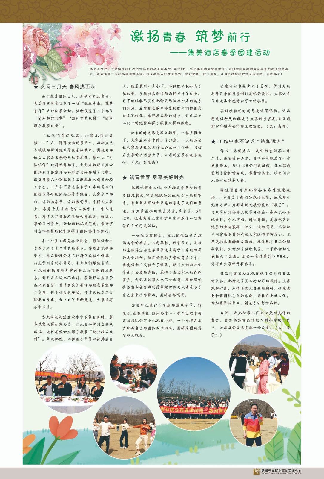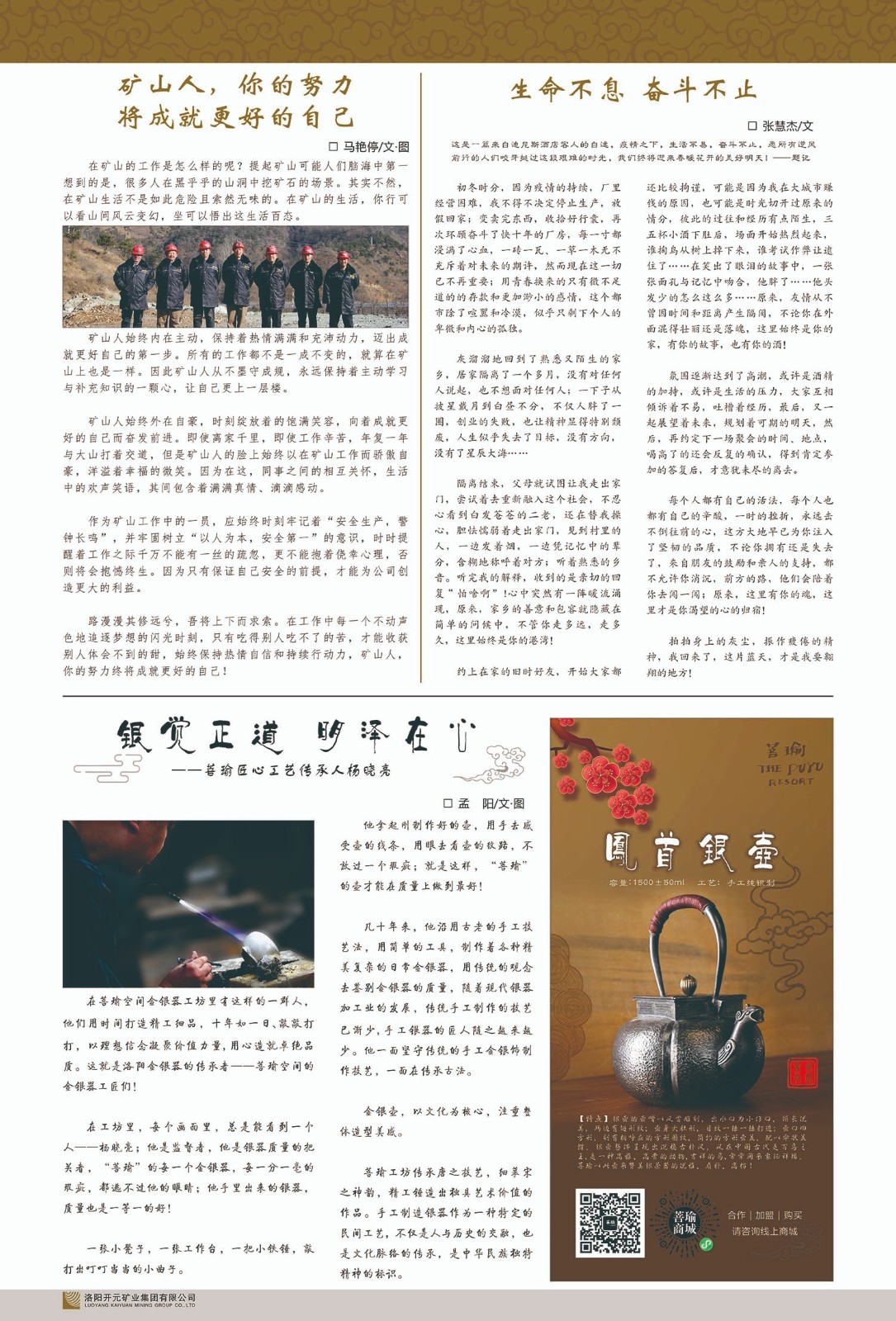 洛陽(yáng)開(kāi)元礦業(yè)集團(tuán)有限公司簡(jiǎn)介洛陽(yáng)開(kāi)元礦業(yè)集團(tuán)有限公司,始成立于2006年,位于洛陽(yáng)市開(kāi)元大道269號(hào)。集團(tuán)旗下共有十余家全資子公司,業(yè)務(wù)涉及有色金屬礦山開(kāi)發(fā)、礦產(chǎn)品購(gòu)銷(xiāo)與進(jìn)出口貿(mào)易、房地產(chǎn)開(kāi)發(fā)、文化藝術(shù)、企業(yè)管理與咨詢(xún)、資本投資等多個(gè)領(lǐng)域。民建河南省委委員、民建河南省委企業(yè)委副主任、民建洛陽(yáng)市委委員、企業(yè)委主任、洛陽(yáng)民建企業(yè)家協(xié)會(huì)會(huì)長(zhǎng)許明月是公司創(chuàng)始人,現(xiàn)任洛陽(yáng)開(kāi)元礦業(yè)集團(tuán)有限公司董事長(zhǎng)。在礦業(yè)領(lǐng)域,洛陽(yáng)開(kāi)元礦業(yè)集團(tuán)擁有多家實(shí)力雄厚的子公司:貴州開(kāi)元礦業(yè)有限公司探、采礦權(quán)面積共11.33平方公里;興??h銅鑫礦業(yè)有限公司探礦權(quán)面積8.76平方公里,礦山資源潛力巨大;2021年,開(kāi)元集團(tuán)與盧氏中科礦業(yè)有限公司開(kāi)展戰(zhàn)略合作。盧氏中科礦業(yè)有限公司專(zhuān)注于有色金屬的浮選、加工和銷(xiāo)售,擁有強(qiáng)大的技術(shù)支撐平臺(tái),是集探、采、選、冶、研為一體的中大型綜合礦業(yè)企業(yè)。目前,盧氏中科王家河1000噸選礦廠已成功投產(chǎn),雙河金礦、柳關(guān)欒盧鉛鋅礦相繼順利開(kāi)工,樓房銀礦與圪老灣鉛鋅礦的深部探礦重大突破,標(biāo)志著礦山版圖取得重大進(jìn)展,為開(kāi)元集團(tuán)后續(xù)發(fā)展奠定了堅(jiān)實(shí)基礎(chǔ)。在文化傳媒領(lǐng)域,洛陽(yáng)市明月美術(shù)館通過(guò)豐富多樣的藝術(shù)展覽、學(xué)術(shù)研討和公共教育活動(dòng),努力打造一個(gè)集展覽、交流、教育、研究為一體的綜合性藝術(shù)平臺(tái)。此外,在金融投資領(lǐng)域,開(kāi)元集團(tuán)旗下的北京明峰資本管理有限公司專(zhuān)注于投資具有高增長(zhǎng)潛力的優(yōu)秀企業(yè),特別是高科技、新能源、環(huán)保等新興產(chǎn)業(yè),為客戶(hù)提供個(gè)性化的資產(chǎn)配置服務(wù)。在做好企業(yè)經(jīng)營(yíng)的同時(shí),開(kāi)元集團(tuán)始終不忘企業(yè)的社會(huì)責(zé)任和家國(guó)情懷,以突出的愛(ài)心公益事跡,開(kāi)展了一系列公益慈善活動(dòng):“民建林”公益事業(yè)通過(guò)“思源基金”“幫幫公益”線(xiàn)上公益平臺(tái),與眾多愛(ài)心人士籌措資金20余萬(wàn)元;資助541名貧困大學(xué)生共計(jì)270余萬(wàn)元,推進(jìn)“數(shù)字助力——河南AI人才培養(yǎng)”;捐款10萬(wàn)元,馳援京津冀、黑龍江洪水地質(zhì)災(zāi)害……公司于2017年底被洛陽(yáng)市慈善總會(huì)評(píng)為“洛陽(yáng)慈善風(fēng)云榜——十大愛(ài)心集體”。洛陽(yáng)開(kāi)元礦業(yè)集團(tuán)有限公司秉承持續(xù)發(fā)展理念,憑借多年來(lái)良好的企業(yè)信譽(yù)與經(jīng)營(yíng)業(yè)績(jī),與全國(guó)多家企業(yè)建立了良好合作關(guān)系,受到社會(huì)各界的一致好評(píng),多次榮獲“納稅標(biāo)兵”“先進(jìn)企業(yè)”“招商引資模范企業(yè)”等榮譽(yù)稱(chēng)號(hào)?;赝麃?lái)時(shí)路,開(kāi)元人勠力同心,以“闖”的精神和“創(chuàng)”的勁頭,一路披荊斬棘,踏過(guò)千山萬(wàn)水;展望新未來(lái),開(kāi)元人凝心聚力,不執(zhí)于“舊”,無(wú)畏于“新”,秉承“勇于跨越,追求卓越”的企業(yè)精神,乘著國(guó)家高質(zhì)量發(fā)展新征程的東風(fēng),跨過(guò)高山,越過(guò)大海,向著集團(tuán)多元化、國(guó)際化的目標(biāo),逐夢(mèng)遠(yuǎn)航,跨越前行!
