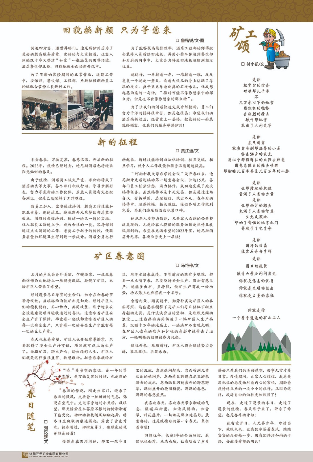 洛陽開元礦業(yè)集團(tuán)有限公司簡介洛陽開元礦業(yè)集團(tuán)有限公司,始成立于2006年,位于洛陽市開元大道269號。集團(tuán)旗下共有十余家全資子公司,業(yè)務(wù)涉及有色金屬礦山開發(fā)、礦產(chǎn)品購銷與進(jìn)出口貿(mào)易、房地產(chǎn)開發(fā)、文化藝術(shù)、企業(yè)管理與咨詢、資本投資等多個領(lǐng)域。民建河南省委委員、民建河南省委企業(yè)委副主任、民建洛陽市委委員、企業(yè)委主任、洛陽民建企業(yè)家協(xié)會會長許明月是公司創(chuàng)始人,現(xiàn)任洛陽開元礦業(yè)集團(tuán)有限公司董事長。在礦業(yè)領(lǐng)域,洛陽開元礦業(yè)集團(tuán)擁有多家實力雄厚的子公司:貴州開元礦業(yè)有限公司探、采礦權(quán)面積共11.33平方公里;興??h銅鑫礦業(yè)有限公司探礦權(quán)面積8.76平方公里,礦山資源潛力巨大;2021年,開元集團(tuán)與盧氏中科礦業(yè)有限公司開展戰(zhàn)略合作。盧氏中科礦業(yè)有限公司專注于有色金屬的浮選、加工和銷售,擁有強(qiáng)大的技術(shù)支撐平臺,是集探、采、選、冶、研為一體的中大型綜合礦業(yè)企業(yè)。目前,盧氏中科王家河1000噸選礦廠已成功投產(chǎn),雙河金礦、柳關(guān)欒盧鉛鋅礦相繼順利開工,樓房銀礦與圪老灣鉛鋅礦的深部探礦重大突破,標(biāo)志著礦山版圖取得重大進(jìn)展,為開元集團(tuán)后續(xù)發(fā)展奠定了堅實基礎(chǔ)。在文化傳媒領(lǐng)域,洛陽市明月美術(shù)館通過豐富多樣的藝術(shù)展覽、學(xué)術(shù)研討和公共教育活動,努力打造一個集展覽、交流、教育、研究為一體的綜合性藝術(shù)平臺。此外,在金融投資領(lǐng)域,開元集團(tuán)旗下的北京明峰資本管理有限公司專注于投資具有高增長潛力的優(yōu)秀企業(yè),特別是高科技、新能源、環(huán)保等新興產(chǎn)業(yè),為客戶提供個性化的資產(chǎn)配置服務(wù)。在做好企業(yè)經(jīng)營的同時,開元集團(tuán)始終不忘企業(yè)的社會責(zé)任和家國情懷,以突出的愛心公益事跡,開展了一系列公益慈善活動:“民建林”公益事業(yè)通過“思源基金”“幫幫公益”線上公益平臺,與眾多愛心人士籌措資金20余萬元;資助541名貧困大學(xué)生共計270余萬元,推進(jìn)“數(shù)字助力——河南AI人才培養(yǎng)”;捐款10萬元,馳援京津冀、黑龍江洪水地質(zhì)災(zāi)害……公司于2017年底被洛陽市慈善總會評為“洛陽慈善風(fēng)云榜——十大愛心集體”。洛陽開元礦業(yè)集團(tuán)有限公司秉承持續(xù)發(fā)展理念,憑借多年來良好的企業(yè)信譽(yù)與經(jīng)營業(yè)績,與全國多家企業(yè)建立了良好合作關(guān)系,受到社會各界的一致好評,多次榮獲“納稅標(biāo)兵”“先進(jìn)企業(yè)”“招商引資模范企業(yè)”等榮譽(yù)稱號?;赝麃頃r路,開元人勠力同心,以“闖”的精神和“創(chuàng)”的勁頭,一路披荊斬棘,踏過千山萬水;展望新未來,開元人凝心聚力,不執(zhí)于“舊”,無畏于“新”,秉承“勇于跨越,追求卓越”的企業(yè)精神,乘著國家高質(zhì)量發(fā)展新征程的東風(fēng),跨過高山,越過大海,向著集團(tuán)多元化、國際化的目標(biāo),逐夢遠(yuǎn)航,跨越前行!