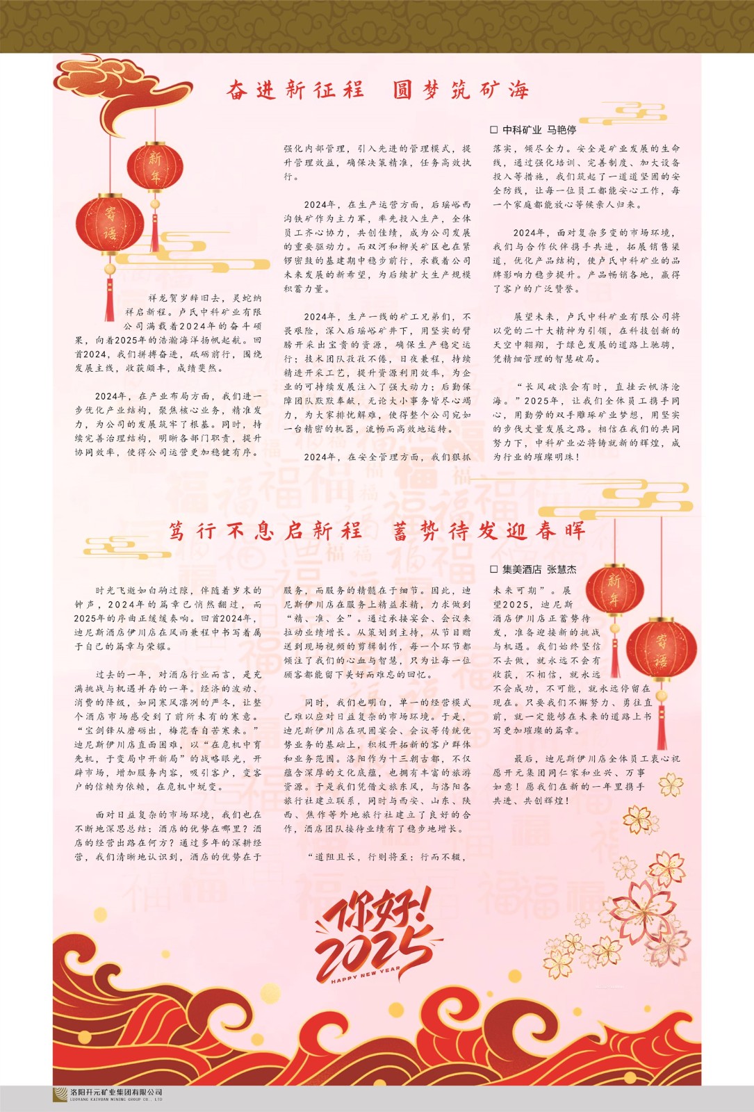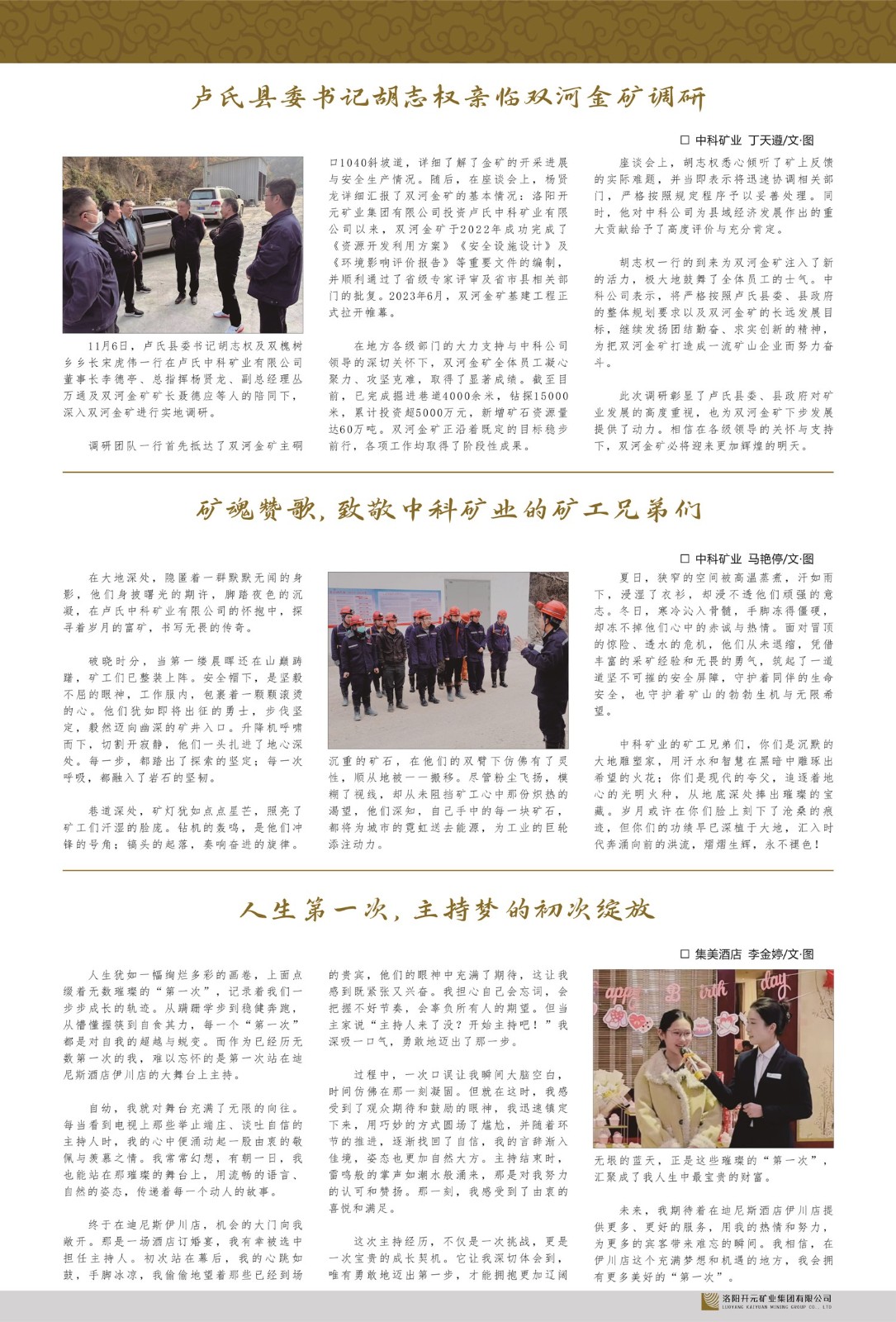 洛陽開元礦業(yè)集團有限公司簡介洛陽開元礦業(yè)集團有限公司,始成立于2006年,位于洛陽市開元大道269號。集團旗下共有十余家全資子公司,業(yè)務(wù)涉及有色金屬礦山開發(fā)、礦產(chǎn)品購銷與進出口貿(mào)易、房地產(chǎn)開發(fā)、文化藝術(shù)、企業(yè)管理與咨詢、資本投資等多個領(lǐng)域。民建河南省委委員、民建河南省委企業(yè)委副主任、民建洛陽市委委員、企業(yè)委主任、洛陽民建企業(yè)家協(xié)會會長許明月是公司創(chuàng)始人,現(xiàn)任洛陽開元礦業(yè)集團有限公司董事長。在礦業(yè)領(lǐng)域,洛陽開元礦業(yè)集團擁有多家實力雄厚的子公司:貴州開元礦業(yè)有限公司探、采礦權(quán)面積共11.33平方公里;興??h銅鑫礦業(yè)有限公司探礦權(quán)面積8.76平方公里,礦山資源潛力巨大;2021年,開元集團與盧氏中科礦業(yè)有限公司開展戰(zhàn)略合作。盧氏中科礦業(yè)有限公司專注于有色金屬的浮選、加工和銷售,擁有強大的技術(shù)支撐平臺,是集探、采、選、冶、研為一體的中大型綜合礦業(yè)企業(yè)。目前,盧氏中科王家河1000噸選礦廠已成功投產(chǎn),雙河金礦、柳關(guān)欒盧鉛鋅礦相繼順利開工,樓房銀礦與圪老灣鉛鋅礦的深部探礦重大突破,標(biāo)志著礦山版圖取得重大進展,為開元集團后續(xù)發(fā)展奠定了堅實基礎(chǔ)。在文化傳媒領(lǐng)域,洛陽市明月美術(shù)館通過豐富多樣的藝術(shù)展覽、學(xué)術(shù)研討和公共教育活動,努力打造一個集展覽、交流、教育、研究為一體的綜合性藝術(shù)平臺。此外,在金融投資領(lǐng)域,開元集團旗下的北京明峰資本管理有限公司專注于投資具有高增長潛力的優(yōu)秀企業(yè),特別是高科技、新能源、環(huán)保等新興產(chǎn)業(yè),為客戶提供個性化的資產(chǎn)配置服務(wù)。在做好企業(yè)經(jīng)營的同時,開元集團始終不忘企業(yè)的社會責(zé)任和家國情懷,以突出的愛心公益事跡,開展了一系列公益慈善活動:“民建林”公益事業(yè)通過“思源基金”“幫幫公益”線上公益平臺,與眾多愛心人士籌措資金20余萬元;資助541名貧困大學(xué)生共計270余萬元,推進“數(shù)字助力——河南AI人才培養(yǎng)”;捐款10萬元,馳援京津冀、黑龍江洪水地質(zhì)災(zāi)害……公司于2017年底被洛陽市慈善總會評為“洛陽慈善風(fēng)云榜——十大愛心集體”。洛陽開元礦業(yè)集團有限公司秉承持續(xù)發(fā)展理念,憑借多年來良好的企業(yè)信譽與經(jīng)營業(yè)績,與全國多家企業(yè)建立了良好合作關(guān)系,受到社會各界的一致好評,多次榮獲“納稅標(biāo)兵”“先進企業(yè)”“招商引資模范企業(yè)”等榮譽稱號?;赝麃頃r路,開元人勠力同心,以“闖”的精神和“創(chuàng)”的勁頭,一路披荊斬棘,踏過千山萬水;展望新未來,開元人凝心聚力,不執(zhí)于“舊”,無畏于“新”,秉承“勇于跨越,追求卓越”的企業(yè)精神,乘著國家高質(zhì)量發(fā)展新征程的東風(fēng),跨過高山,越過大海,向著集團多元化、國際化的目標(biāo),逐夢遠(yuǎn)航,跨越前行!