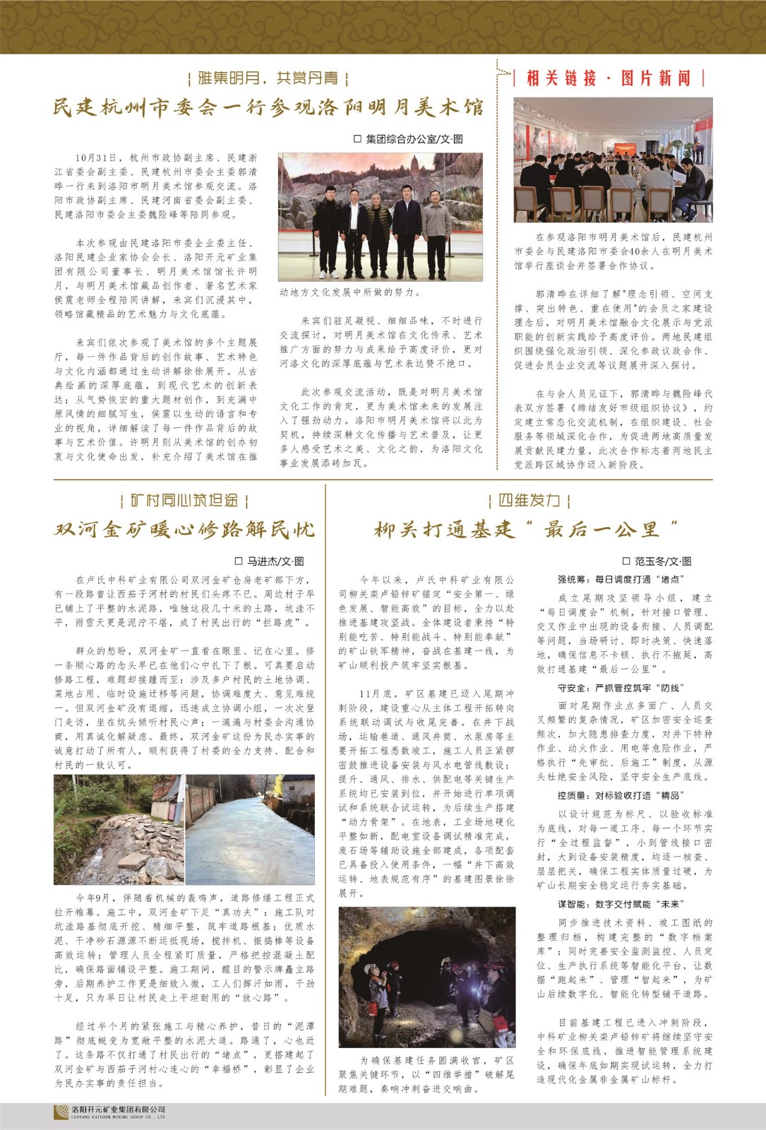 洛陽開元礦業(yè)集團(tuán)有限公司簡(jiǎn)介洛陽開元礦業(yè)集團(tuán)有限公司,始成立于2006年,位于洛陽市開元大道269號(hào)。集團(tuán)旗下共有十余家全資子公司,業(yè)務(wù)涉及有色金屬礦山開發(fā)、礦產(chǎn)品購(gòu)銷與進(jìn)出口貿(mào)易、房地產(chǎn)開發(fā)、文化藝術(shù)、企業(yè)管理與咨詢、資本投資等多個(gè)領(lǐng)域。民建河南省委委員、民建河南省委企業(yè)委副主任、民建洛陽市委委員、企業(yè)委主任、洛陽民建企業(yè)家協(xié)會(huì)會(huì)長(zhǎng)許明月是公司創(chuàng)始人,現(xiàn)任洛陽開元礦業(yè)集團(tuán)有限公司董事長(zhǎng)。在礦業(yè)領(lǐng)域,洛陽開元礦業(yè)集團(tuán)擁有多家實(shí)力雄厚的子公司:貴州開元礦業(yè)有限公司探、采礦權(quán)面積共11.33平方公里;興??h銅鑫礦業(yè)有限公司探礦權(quán)面積8.76平方公里,礦山資源潛力巨大;2021年,開元集團(tuán)與盧氏中科礦業(yè)有限公司開展戰(zhàn)略合作。盧氏中科礦業(yè)有限公司專注于有色金屬的浮選、加工和銷售,擁有強(qiáng)大的技術(shù)支撐平臺(tái),是集探、采、選、冶、研為一體的中大型綜合礦業(yè)企業(yè)。目前,盧氏中科王家河1000噸選礦廠已成功投產(chǎn),雙河金礦、柳關(guān)欒盧鉛鋅礦相繼順利開工,樓房銀礦與圪老灣鉛鋅礦的深部探礦重大突破,標(biāo)志著礦山版圖取得重大進(jìn)展,為開元集團(tuán)后續(xù)發(fā)展奠定了堅(jiān)實(shí)基礎(chǔ)。在文化傳媒領(lǐng)域,洛陽市明月美術(shù)館通過豐富多樣的藝術(shù)展覽、學(xué)術(shù)研討和公共教育活動(dòng),努力打造一個(gè)集展覽、交流、教育、研究為一體的綜合性藝術(shù)平臺(tái)。此外,在金融投資領(lǐng)域,開元集團(tuán)旗下的北京明峰資本管理有限公司專注于投資具有高增長(zhǎng)潛力的優(yōu)秀企業(yè),特別是高科技、新能源、環(huán)保等新興產(chǎn)業(yè),為客戶提供個(gè)性化的資產(chǎn)配置服務(wù)。在做好企業(yè)經(jīng)營(yíng)的同時(shí),開元集團(tuán)始終不忘企業(yè)的社會(huì)責(zé)任和家國(guó)情懷,以突出的愛心公益事跡,開展了一系列公益慈善活動(dòng):“民建林”公益事業(yè)通過“思源基金”“幫幫公益”線上公益平臺(tái),與眾多愛心人士籌措資金20余萬元;資助541名貧困大學(xué)生共計(jì)270余萬元,推進(jìn)“數(shù)字助力——河南AI人才培養(yǎng)”;捐款10萬元,馳援京津冀、黑龍江洪水地質(zhì)災(zāi)害……公司于2017年底被洛陽市慈善總會(huì)評(píng)為“洛陽慈善風(fēng)云榜——十大愛心集體”。洛陽開元礦業(yè)集團(tuán)有限公司秉承持續(xù)發(fā)展理念,憑借多年來良好的企業(yè)信譽(yù)與經(jīng)營(yíng)業(yè)績(jī),與全國(guó)多家企業(yè)建立了良好合作關(guān)系,受到社會(huì)各界的一致好評(píng),多次榮獲“納稅標(biāo)兵”“先進(jìn)企業(yè)”“招商引資模范企業(yè)”等榮譽(yù)稱號(hào)。回望來時(shí)路,開元人勠力同心,以“闖”的精神和“創(chuàng)”的勁頭,一路披荊斬棘,踏過千山萬水;展望新未來,開元人凝心聚力,不執(zhí)于“舊”,無畏于“新”,秉承“勇于跨越,追求卓越”的企業(yè)精神,乘著國(guó)家高質(zhì)量發(fā)展新征程的東風(fēng),跨過高山,越過大海,向著集團(tuán)多元化、國(guó)際化的目標(biāo),逐夢(mèng)遠(yuǎn)航,跨越前行!